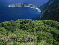 母島・ワダンノキ繁る堺ガ岳から大崩湾と東崎を望む