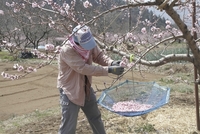摘花作業する桃畑。飯坂にて
