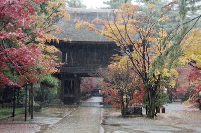 雨降る平林寺山門の紅葉