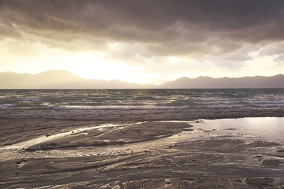 夕日に輝く波打ち際