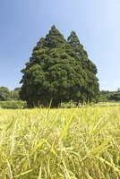 稲穂と杉の巨木 小杉の大杉 曲川の大杉