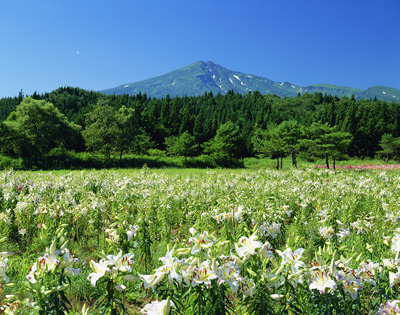 ユリの花咲く鳥海高原から鳥海山(出羽富士)
