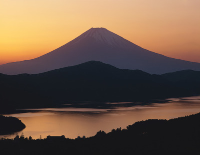 大観山から芦ノ湖と富士山夕照