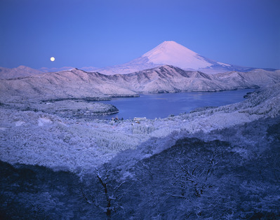 大観山から芦ノ湖と黎明の富士山と満月