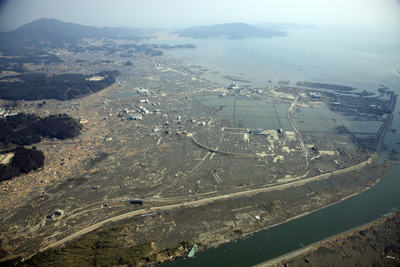 東日本大震災の津波で壊された街と旧北上川