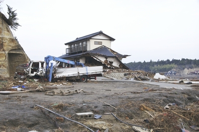 東日本大震災の津波で壊れたトラックと民家