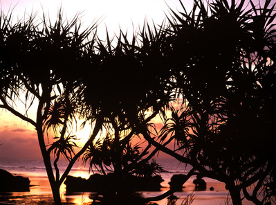 アダンと夕日。西表島・星砂の浜