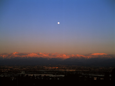 夕日に染まる立山連峰の天空に満月