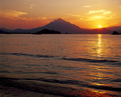 開聞岳と夕陽の浜辺