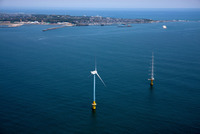洋上風力発電所の風車と風況観測タワー(銚子の南沖)