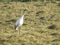 朝の牧草地で餌を探すタンチョウ