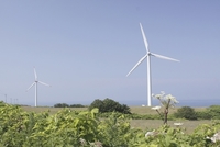 風力発電の風車と日本海