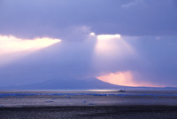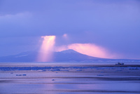 朝の斜光と国後島と流氷
