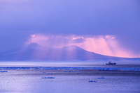 朝の流氷と国後島とスケソウダラ漁船
