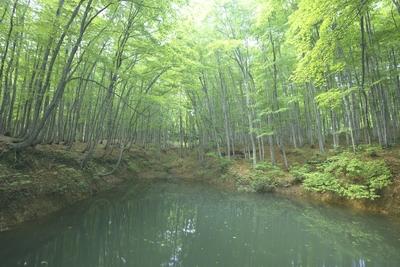ブナ林の新緑と池