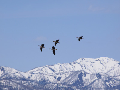 朝霧に飛ぶマガン