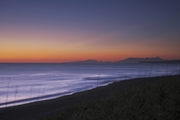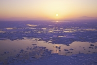 知床連山とオホーツク海の日の出と流氷
