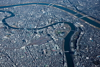 岩淵水門(荒川、隅田川)より都心方面