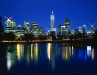 市内の池に映るダウンタウンビル群