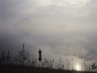 朝の洞爺湖と釣り人