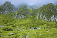 千畳敷カールの高山植物お花畑を歩く登山者