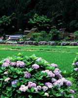 茅葺きの民家と紫陽花
