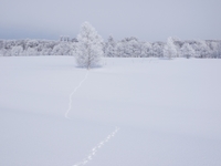 霧氷と雪原とキタキツネの足跡