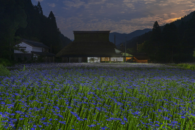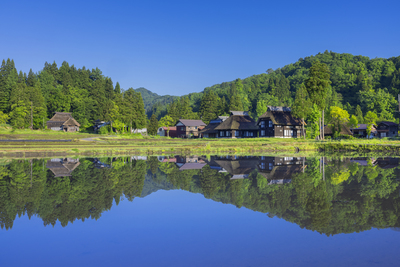 新緑の荻ノ島かやぶきの里と水田