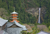 雨の西岸渡寺三重の塔と那智の滝