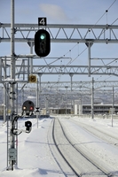 雪の函館本線旭川駅構内と信号機