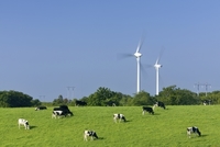 風力発電の風車と乳牛