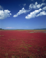 サンゴ草咲く能取湖上空に浮かぶ白い雲