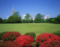 ツツジ咲く新宿御苑よりビル街