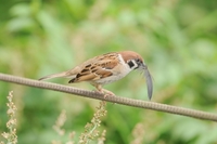 スズメ 巣材に鳥の羽を集める