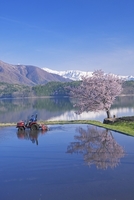 田起こしと桜咲く青木湖より白馬連峰