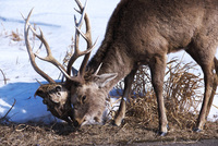 エゾシカとツノに絡みついた死骸の頭