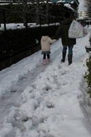 雪に足跡を残す親子 雪道
