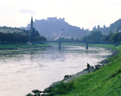 ザルツブルク州,Land Salzburg,ザルツブルグ,サルツブルク,Salzburg,ザルツ(塩の)ブルク(城),ザルツァッハ川,Salzach,ホーエンザルツブルク城,Festung Hohensalzburg,朝,釣り人