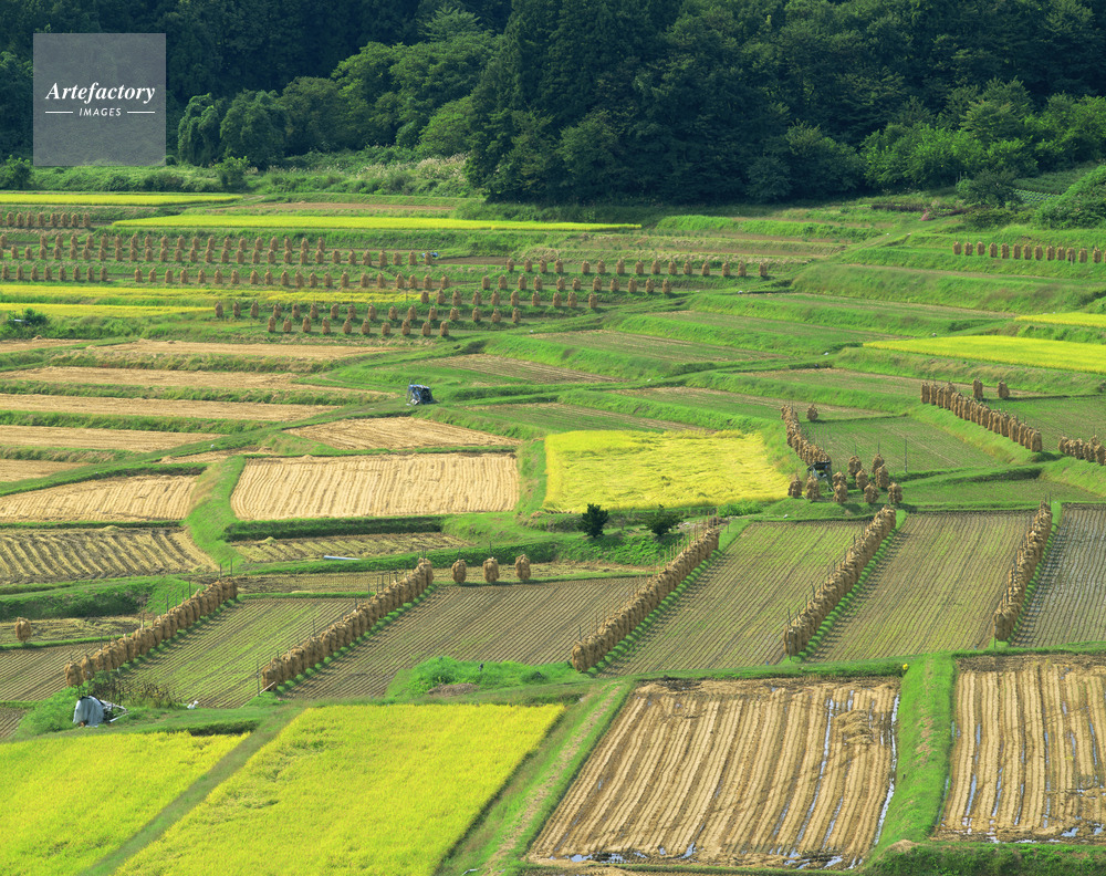 | 作品タイトル | 椹平(くぬぎたいら) 稲刈りと杭掛けの頃 棚田百選 | モデルリリース | なし | |