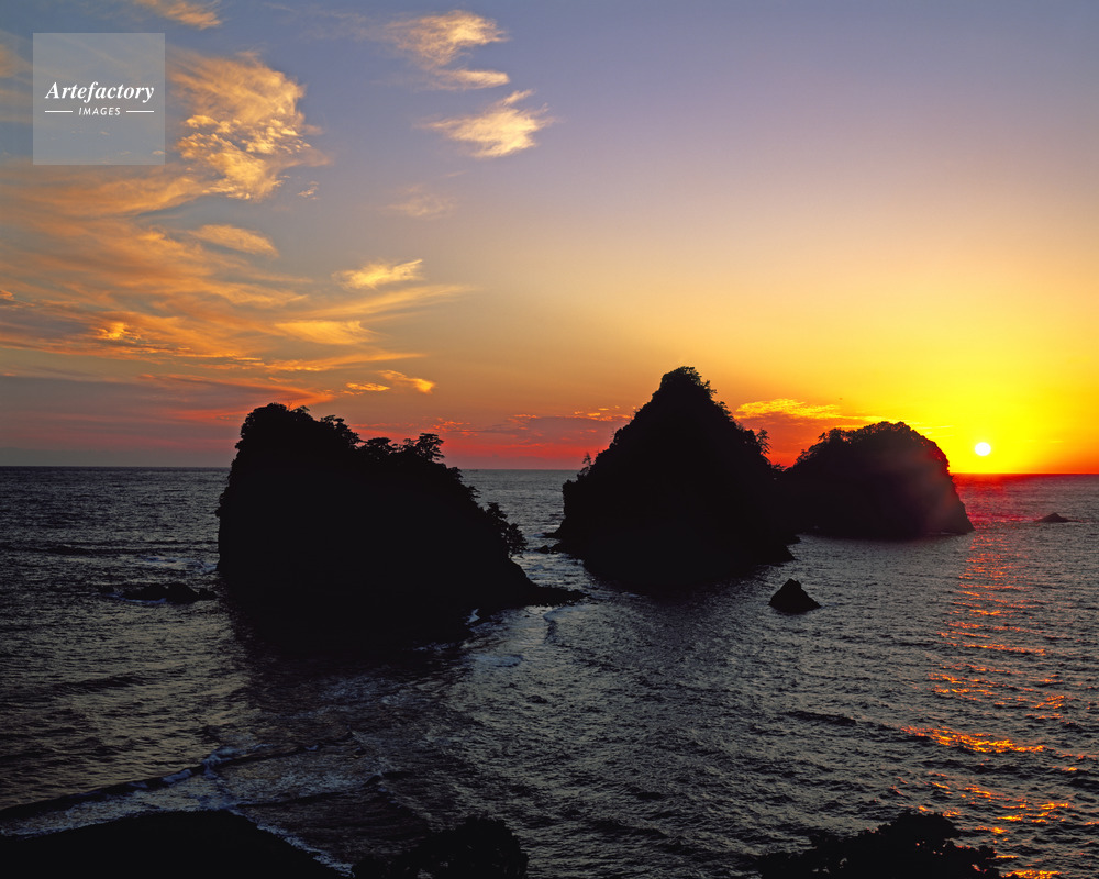 | 作品タイトル | 堂ヶ島海岸。象島・中の島・高島(三四郎島)と夕日 | モデルリリース | なし | |