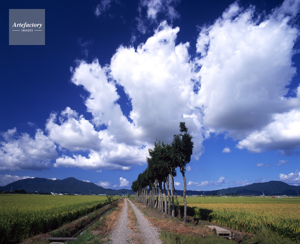 | 作品タイトル | 新潟産コシヒカリと稲架木のある小道と弥彦山。新潟平野 | モデルリリース | なし | |