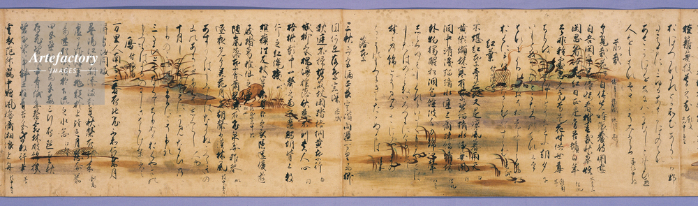 | キャプション | 紙本墨書,2巻, 芦手絵を描いた料紙に『和漢朗詠集』を書写したもので、下巻に「永暦元年四月四日、右筆黷之、司農少卿伊行」という奥書があり、永暦元年(1160)に藤原行成(972~1027)の五代の孫世尊寺伊行によって書写されたものであることがわかる。伊行は能書家として知られ、書道の秘伝書『夜鶴庭訓抄』を著したことでも知られる。 芦手絵とは、平安時代後期に流行した「芦手」と呼ばれた文字を取り込んだ絵のこと。芦・鳥・水流などさまざまな景物(四季の風物)のなかに、文字を絵画化して書き混ぜた「芦手」の意匠は、衣装や家具など多分野に (..) | 制限事項 | ||