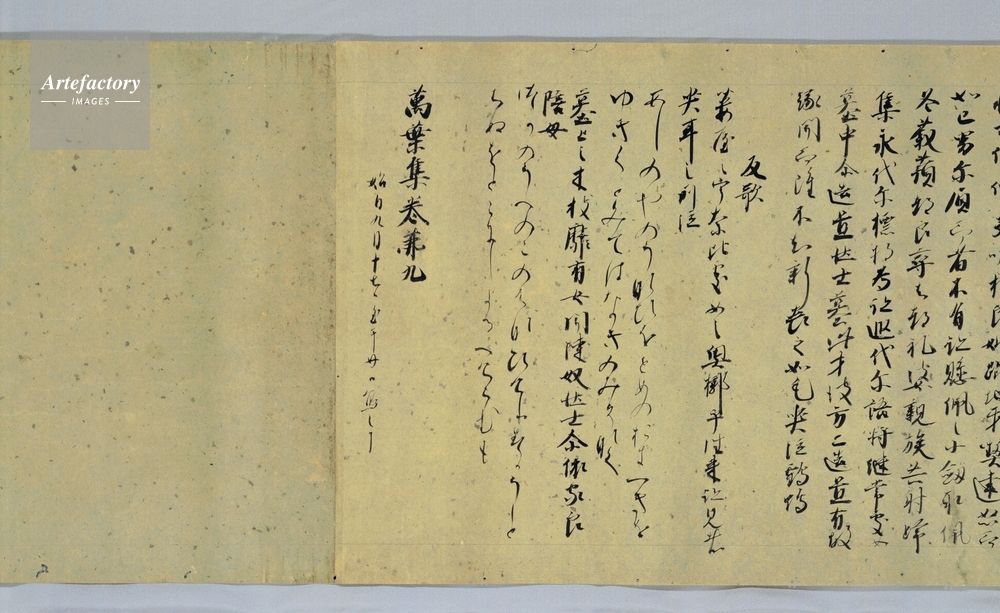 | キャプション | 紙本墨書,1巻, 藍で漉染めした料紙に書かれていることから「藍紙本」の名で呼ばれる『万葉集』の古写本。全紙にわたり銀の揉み箔を撒(ま)く。 筆者は藤原行成の孫、藤原伊房(1030~1096)とする説が有力。伊房は速筆をもって知られ、この1巻も「始自九月十七日、至于廿日、写之了」という奥書からすれば、わずか4日間で書写し終えていたことになる。書風はいかにも早書きで、この時代にはめずらしく男性的な筆致を示す。 奈良時代に編纂された我が国最古の歌集『万葉集』は、平安時代末期まで30種以上の写本が伝来していたといわれる。しかし、現 (..) | 制限事項 | ||