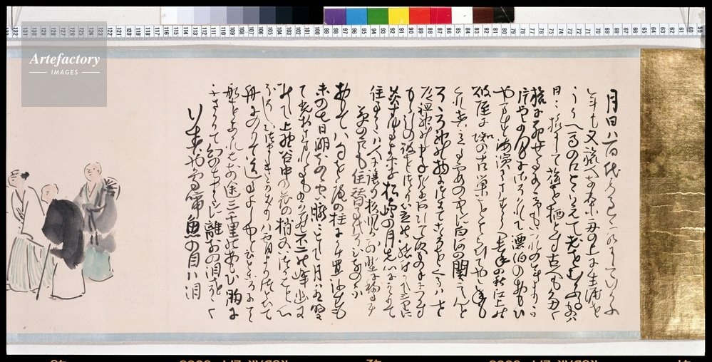 | キャプション | 紙本淡彩,2巻 本紙各縦29.2cm 全体縦31.0cm, 芭蕉の『奥の細道』の本文を書写し、それに蕪村が俳画を新たに描き加えたもの。全二巻からなる。 | 制限事項 | ||