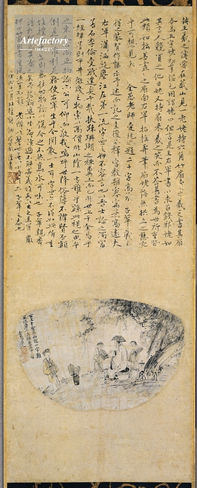 | キャプション | 紙本墨画,1幅, 書聖王羲之が扇売りの老婆のために扇に字を書いてやったので、人々が競って買ったという故事を描く。大樹のもとに坐って揮毫する王羲之を中心に2童子と老婆を、扇面の形を巧みに生かしながら調和よく配している。図中に大岳周崇(だいがくしゅうすう)の賛があり、図上に惟肖得巌(いしょうとくがん)の永享2年(1430)の追題がある。この題記によれば、この扇子は如拙(じょせつ)が描き、周崇が愛用し、のちに弟子の子鞏蔵主(しきょうぞうす)が掛幅に仕立てたことが知れる。南宋の梁楷(りょうかい)に私淑した如拙が減筆的手法を駆使して描 (..) | 制限事項 | ||