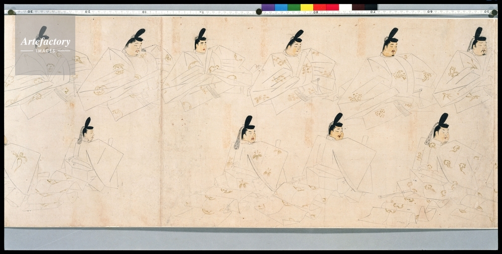 紙本淡彩,9紙 縦 36.2 cm 全長 521.6 cm, 摂関大臣などの公卿57人を上下2段に、上段は前を向いて、下段は背向して振り向く姿で描くもので、かつて「年中行事着坐図巻」と呼ばれたが、ある時の行事に集う人を描くものではなく、公家の列坐影である。宮内庁本天子摂関影によって像主を見ると、巻首の藤原忠通から、建長4年(1252)補任の摂関大臣まで描かれている。 筆者を藤原信実と伝えるように、画風は細線をひき重ねて像主の相貌を写し取る似絵の伝統的技法が生きており、隆信、信実以来の似絵の家系に筆者を求め得る。束帯の文様に有職を無視して蕪や大根まで描くのは異例 (..) |