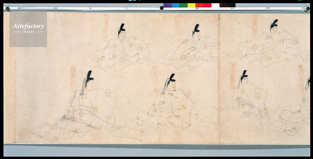 紙本淡彩,9紙 縦 36.2 cm 全長 521.6 cm, 摂関大臣などの公卿57人を上下2段に、上段は前を向いて、下段は背向して振り向く姿で描くもので、かつて「年中行事着坐図巻」と呼ばれたが、ある時の行事に集う人を描くものではなく、公家の列坐影である。宮内庁本天子摂関影によって像主を見ると、巻首の藤原忠通から、建長4年(1252)補任の摂関大臣まで描かれている。 筆者を藤原信実と伝えるように、画風は細線をひき重ねて像主の相貌を写し取る似絵の伝統的技法が生きており、隆信、信実以来の似絵の家系に筆者を求め得る。束帯の文様に有職を無視して蕪や大根まで描くのは異例 (..) |