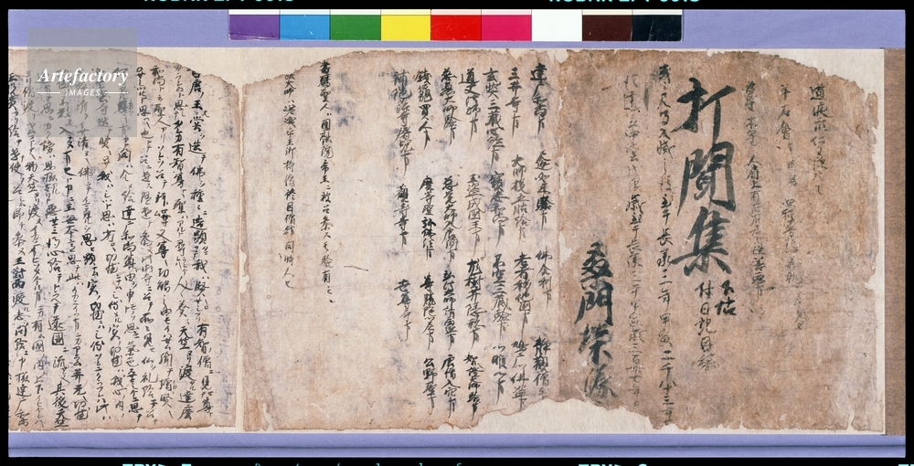 | キャプション | 紙本墨書,1巻 縦 30.2 cm 横 25.5 cm 総長 850.0 cm, 仏教説話集『打聞集(うちききしゅう)』の古写本。もと二帖または三帖であったと推定されるが、今は下帖だけが残る。表紙に署名した栄源は、この本の所持者であり、またこれを書写した筆者とも思われる。書写の時期は、紙背文書の年記等より長承三年(1134)頃と考えられる。紙背文書は大半が比叡山延暦寺に関わるものである。 | 制限事項 | ||