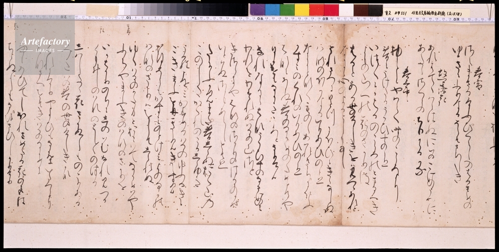 | キャプション | 紙本墨書,1巻 縦 30.8 cm 横 378.0 cm, 伏見天皇(1265~1317)が、日頃詠まれた和歌を歌集としてまとめるために書き留められた草稿。世に「広沢切」と称され鎌倉時代における仮名の名筆として珍重されている。 この一巻は蜂須賀(はちすか)家に伝来したもので春部66首、秋部8首の計74首を収め、紙背には嘉元3年の具注暦及び文書があり、広沢切の成立や伝来を研究する上にも貴重なもの。 |