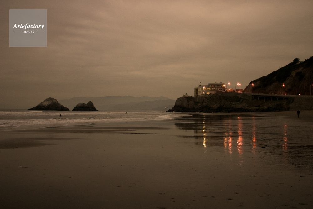 Seal Rocks and the Cliff House under overcast skies this evening in San Francisco. You can also see surfers in the water in front of the rocks. More photos of the San Francisco Bay Area窶ヲ |